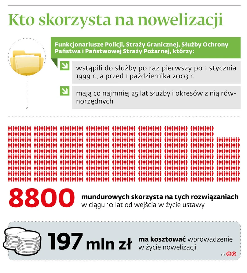 DGP dotarł do projektu nowelizacji przepisów w tej sprawie. Ma on objąć funkcjonariuszy policji, Straży Granicznej, Służby Ochrony Państwa i Państwowej Straży Pożarnej przyjętych do służby po raz pierwszy po 1 stycznia 1999 r. a przed 1 października 2003 r. , którzy mają co najmniej 25 lat służby. W ich przypadku w wysłudze emerytalnej mają zostać uwzględnione okresy pracy cywilnej. Oznacza to brak możliwości pobierania dwóch emerytur – policyjnej i powszechnej.