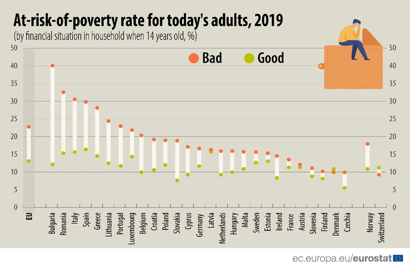 Wskaźnik zagrożenia ubóstwem dzisiejszych dorosłych, które w dzieciństwie spotkały się z ubóstwem w domu, wahał się od 10,2 proc. w Czechach, do 40,1 proc. w Bułgarii. Z drugiej strony, wskaźnik zagrożenia ubóstwem wśród dorosłych, które jako dzieci mały dobrą sytuację finansową w rodzinnym domu wahał się od 5,9 proc. w Czechach, do 16,6 proc. w Hiszpanii. W obu kategoriach polskie wskaźniki plasują nasz kraj w środku stawki. W 2019 r. w Polsce wskaźnik zagrożenia ubóstwem wśród osób dorosłych (w wieku od 25 do 59 lat) według poziomu sytuacji finansowej ich gospodarstw domowych z czasów młodości wynosił 19,2 proc. w przypadku złej i 12,3 proc, w przypadku dobrej sytuacji finansowej w rodzinie.