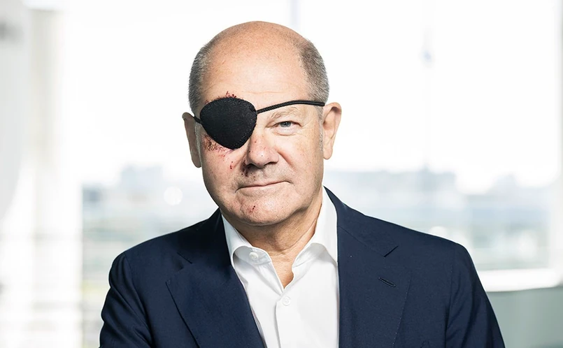 Opaska zakrywa prawe oko, na zdjęciu widać też inne urazy i otarcia na twarzy. "Okolica prawego oka kanclerza jest mocno spuchnięta, jednak oko nie zostało uszkodzone" – informuje się dziennik "Bild".