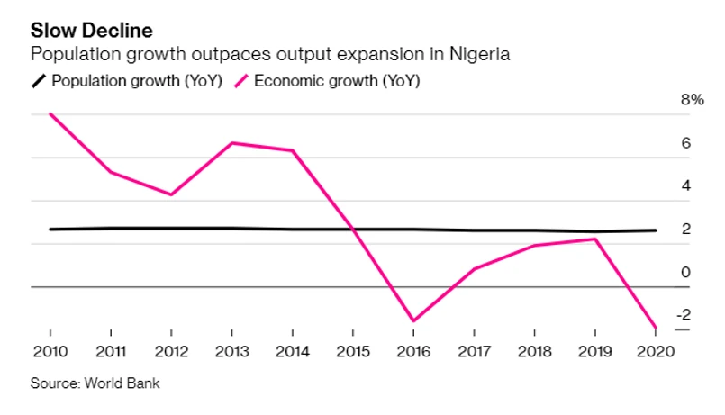 Pandemia pogorszyła sytuację ludności. Osobiste dochody Nigeryjczyków spadną wkrótce prawdopodobnie do najniższego poziomu od czterech dekad, spychając w 2022 roku poniżej progu ubóstwa kolejne 11 milionów osób. Jedna trzecia Nigeryjczyków w wieku produkcyjnym nie ma pracy. W 2015 roku prezydentem kraju został Muhammadu Buhari. Obiecywał, że doprowadzi do znacznego spadku bezrobocia. W rzeczywistości, w połowie jego drugiej kadencji, doprowadził do jego czterokrotnego wzrostu.