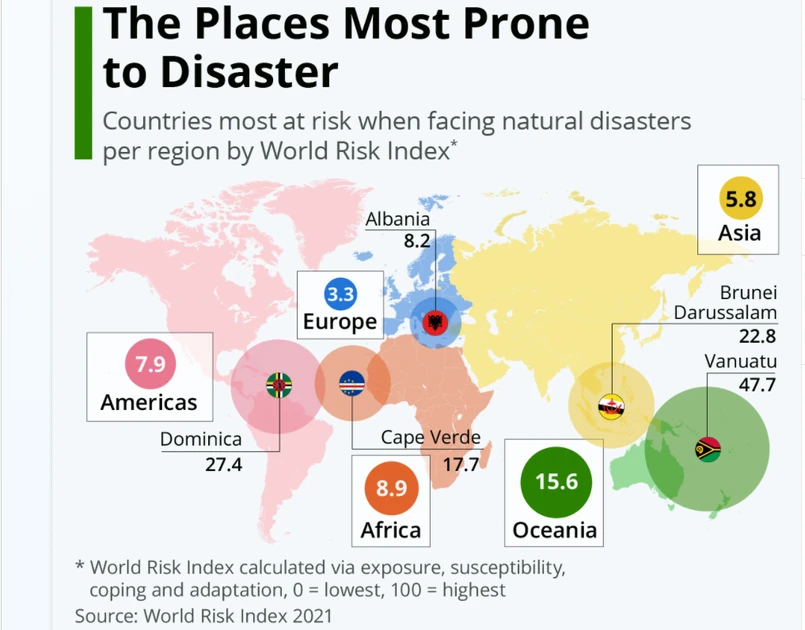 To wyniki tzw. World Risk Index 2021, które bierze pod uwagę ekspozycję, wrażliwość, zdolność do radzenia sobie oraz adaptacji do ekstremalnych zjawisk pogodowych poszczególnych regionów. Indeks przyjmuje wartości od 0 do 100, przy czym druga z wartości oznacza najtrudniejszą sytuację. Wartość indeksu dla poszczególnych regionów to: