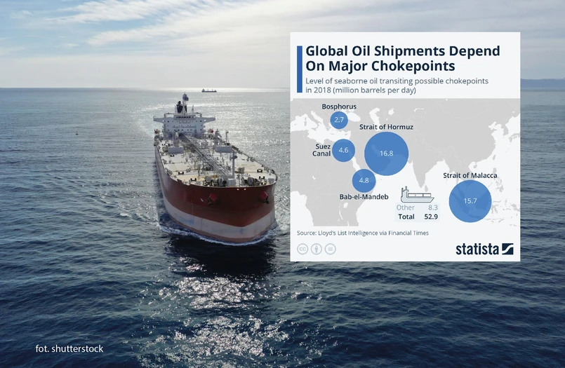 Infografika statista.com pokazuje, że Cieśnina Ormuz ma kluczowe znaczenie dla przepływu ropy na całym świecie. Według najnowszych dostępnych i porównywalnych danych w 2018 r. przez Cieśninę przepływało średnio 16,8 mln baryłek ropy dziennie, co stanowi ponad 30 proc. wszystkich morskich tranzytów ropy i czyni ją jednym z największych wąskich gardeł dla światowych dostaw ropy.