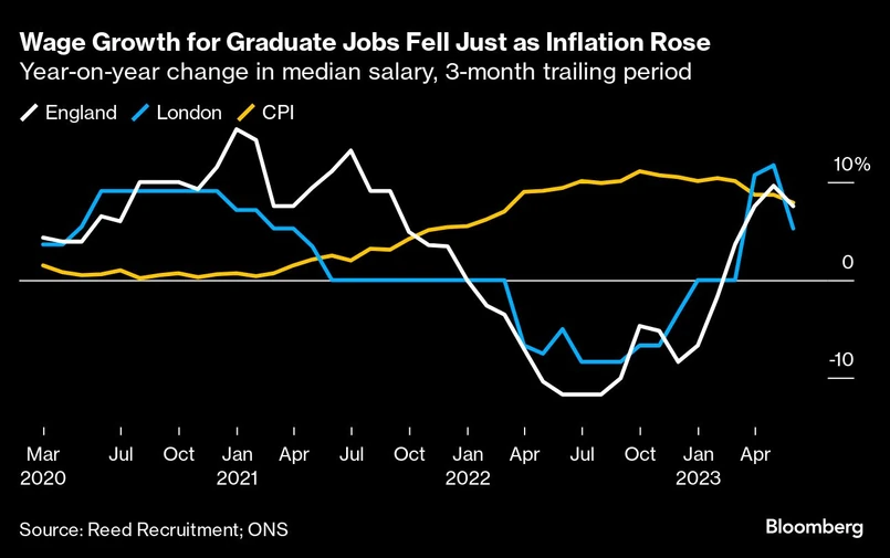 1/6 Podczas gdy Wielkiej Brytanii udało się jak dotąd uniknąć recesji, to zagrożenie nadal jest duże. Raport Bloomberg Reed Jobs pokazuje, że w porównaniu z rokiem poprzednim liczba ofert pracy spadła o prawie jedną czwartą w ciągu trzech miesięcy do czerwca, co wskazuje, że na horyzoncie może pojawić się możliwe pogorszenie koniunktury, które w konsekwencji może doprowadzić do zwolnień. Wykształcenie uniwersyteckie, które od dawna było czynnikiem zwiększającym zarobki, również już nie wystarcza, aby podnieść płace. Analiza reklamowanych stanowisk dla absolwentów w Reed Recruitment pokazuje, że średni wzrost wynagrodzeń zaczął spadać w momencie, gdy wzrost cen nabrał tempa, co doprowadziło do realnych cięć dla tych pracowników. Tymczasem zarówno premier Rishi Sunak, jak i prezes Banku Anglii Andrew Bailey wezwali do ograniczenia płac, aby uniknąć napędzania inflacji.
