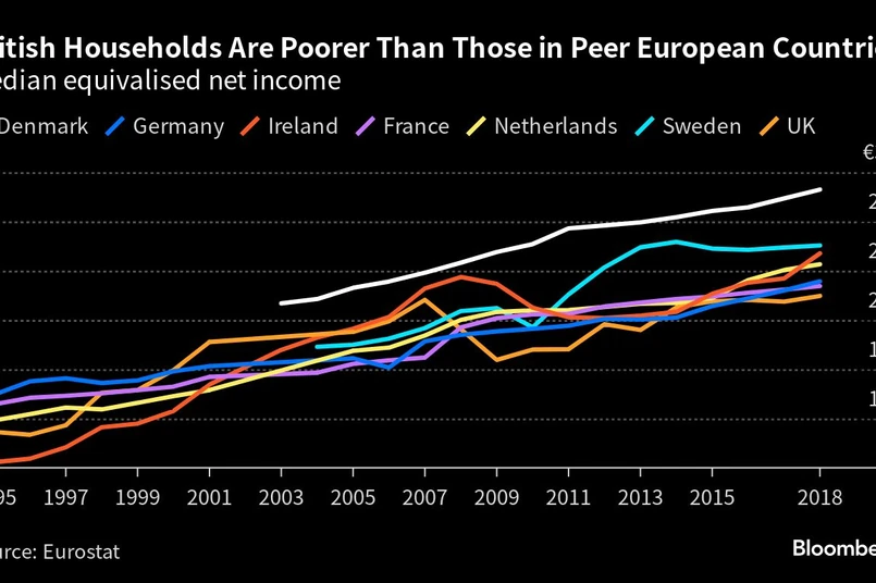 2/6 Jednocześnie obciążenie podatkowe kraju jest najwyższe od zakończenia drugiej wojny światowej. Łącznie, w pięciu z ostatnich sześciu kwartałów dochód do dyspozycji na osobę spadł w brytyjskich gospodarstwach domowych. Starsi pracownicy mogą korzystać z oszczędności, co nie dotyczy niedawnych absolwentów, którzy dopiero są na dorobku. Pomaga to również wyjaśnić, dlaczego 10,4 proc. nowo zatrudnionych pracowników rezygnuje z opłacania składek emerytalnych, zgodnie z najnowszymi danymi z sierpnia ubiegłego roku. To jest brytyjski problem. Analizy przeprowadzone przez think tank pokazują, że porównując siłę nabywczą w Europie w latach 2007-2018, gospodarstwa domowe odnotowały skok o 27 proc. w Niemczech i 34 proc. we Francji. Tymczasem Wielka Brytania odnotowała 2-proc. spadek w tym samym okresie.