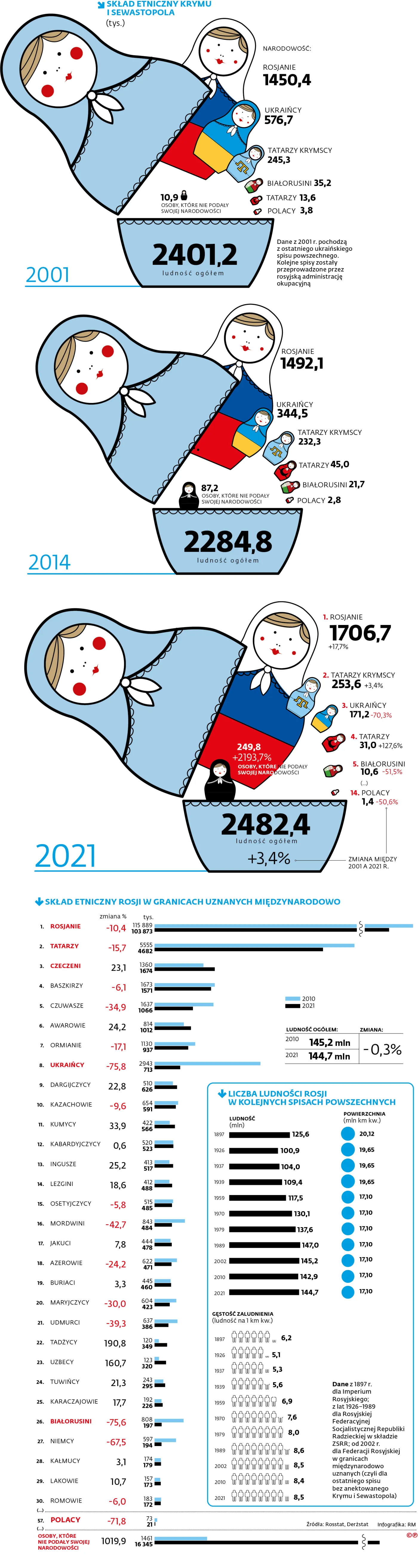 Analogiczny proces jak w Rosji zachodzi na okupowanym Krymie. W republice wraz z wydzielonym miastem Sewastopol mieszka według spisu z 2021 r. o 70 proc. mniej Ukraińców oraz o połowę mniej Białorusinów i Polaków niż w 2001 r., gdy ostatni spis przeprowadziła Ukraina. Za to liczba Rosjan miała tam wzrosnąć o jedną szóstą (sytuację na Krymie komentuje w tekście obok Tamiła Taszewa, ukraińska polityczka odpowiadająca za półwysep).