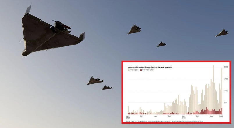 Z opublikowanego przez gazetę wykresu wynika, że największą liczbę rosyjskich dronów odnotowano w drugim tygodniu lipca – ponad 2000 sztuk. To rekord od początku wojny. Najpotężniejszy nalot dronów miał miejsce w nocy z 6 na 7 września: według ukraińskich wojskowych Rosja wysłała wtedy 810 maszyn bojowych i wabików. Kijów twierdzi, że zestrzelono około 92 proc. z nich, lecz 63 przedarły się przez obronę.