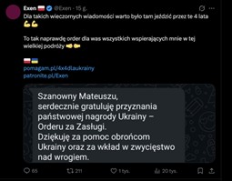 - Dla takich wieczornych wiadomości warto było tam jeździć przez te 4 lata. To tak naprawdę order dla was wszystkich wspierających mnie w tej wielkie podróży - pisze Exen na platformie X.