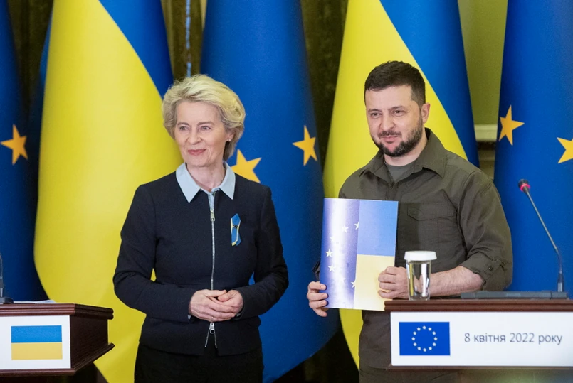 Von der Leyen wręczyła na konferencji prasowej Zełenskiemu dokumenty, które strona ukraińska musi wypełnić, by KE mogła formalnie przedstawić Radzie Europejskiej opinię dotyczącą uznania Ukrainy za państwo kandydujące do UE. Ta procedura zazwyczaj zajmuje lata, ale w związku z wyjątkowymi okolicznościami, z rosyjską agresją na Ukrainę, zobowiązaliśmy się do tego, że przeprowadzimy ją w kilka tygodni - zaznaczyła von der Leyen. Przyjmując kopertę z formularzami Zełenski zapowiedział, że odpowiedź strony ukraińskiej będzie gotowa w przeciągu tygodnia.