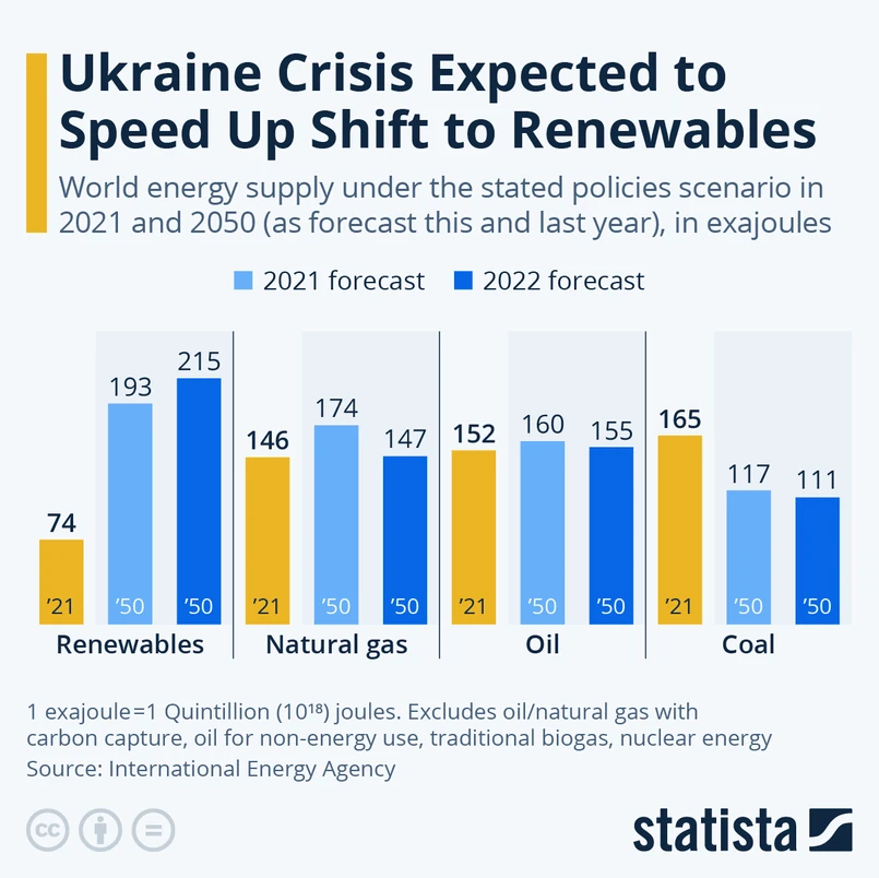 Wojna w Ukrainie i wykorzystanie przez Kreml węglowodorów jako broni wobec Zachodu zmusiło MAE do zweryfikowania tego poglądu. W raporcie z 27 października bieżącego roku MAE zamieściła uaktualnioną prognozę, według której trwający obecnie na wschodzie Europy konflikt spowoduje w nadchodzących latach bardzo szybki odwrót od paliw kopalnych oraz wzrost udziału zeroemisyjnej energii do 29 proc. (ok. 215 eksadżuli).