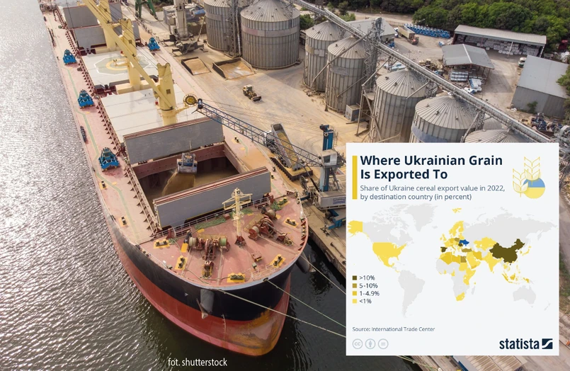 Przepływ zboża z ukraińskich portów nad Morzem Czarnym ma kluczowe znaczenie dla sytuacji żywnościowej w wielu częściach świata. Wycofanie się Rosji z porozumienia zbożowego gwarantującego możliwość transportu ukraińskiego zboża przez Morze Czarne dla mieszkańców wielu państw może oznaczać głód. Grafika statista.com pokazuje, że od początku Inicjatywy z ukraińskich portów wypłynęło 32,9 mln ton zboża.