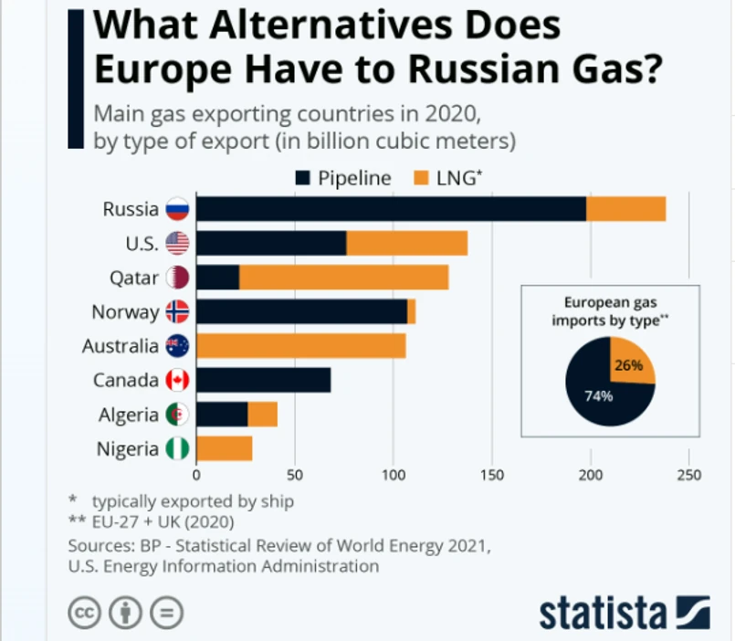 Główne dwa źródła gazu to paliwo tłoczone przez gazociągi lub LNG, który zazwyczaj jest importowany do UE statkami. W 2020 roku 74 proc. surowca eksportowanego do 27 krajów UE (plus Wielka Brytania) to był surowiec w tradycyjnej postaci. Za 26 proc. odpowiadał gaz w postaci skroplonej (LNG) - pisze statista.com.