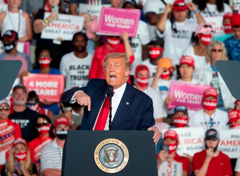 "Mówią teraz, że jestem odporny" - oznajmił, odnosząc się do choroby, którą niedawno przeszedł. Przed wiecem zespół medyczny Białego Domu przekazał, że testy Trumpa na Covid-19 dały wynik negatywny.