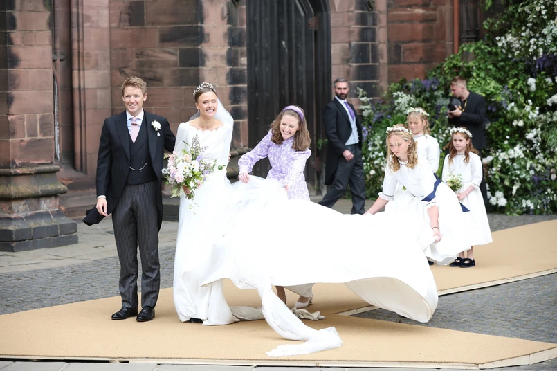 Do czasu zaręczyn z 31-letnią Olivią Henson, którą w piątek poślubił, był też uznawany za "najbardziej pożądanego kawalera" w Wielkiej Brytanii. W ślubie w katedrze w Chester w północno-zachodniej Anglii uczestniczyło ok. 400 gości, w tym następca tronu książę William i księżniczka Eugenia. Przed katedrą zgromadziły się tysiące ludzi chcących obejrzeć przyjazd i odjazd pary młodej. W momencie gdy goście wychodzili z katedry, dwie starsze wiekiem aktywistki Just Stop Oil wyciągnęły gaśnice proszkowe i rozpyliły pomarańczowy proszek na zgromadzonych.