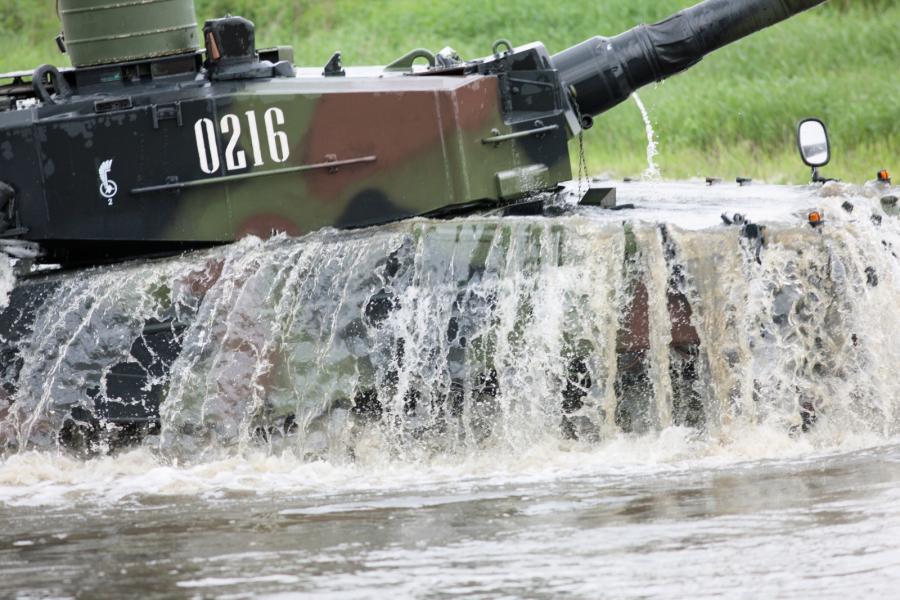 W Ośrodku Ćwiczeń Biała Góra w woj. lubuskim trwają ćwiczenia jednostek 11. Lubuskiej Dywizji Kawalerii Pancernej. Pancerniacy na rzece Odrze ćwiczą pokonywanie przeszkody wodnej. Szkolenia zaczęły się 5 czerwca i potrwają przez dwa tygodnie. Czołgiści muszą połączyć trzy elementy rury stanowiącej szyb powietrzny, założyć uszczelnienia, zabezpieczyć wnętrze wozu oraz przestrzeni między wieżą i kadłubem oraz zainstalować przewody łączności na czołg. <br><br> fot. (zuz) PAP/Lech Muszyński