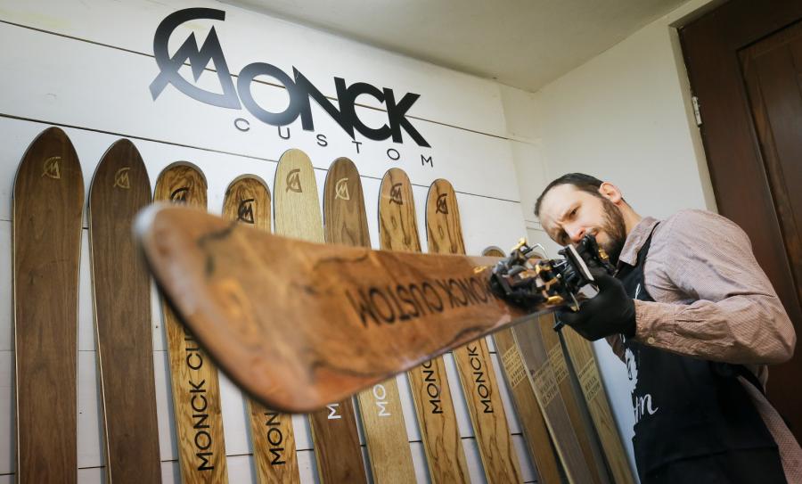 Drewniane narty Monck Custom to sprzęt dla prawdziwych koneserów śnieżnego szaleństwa. Ekskluzywne narty powstają w... niewielkiej piwnicy domu pod Piasecznem niedaleko Warszawy. Na wykonanie jednej pary trzeba poświęcić od 40 do 50 godzin. Narty Monck Custom robione są ręcznie na zamówienie. Na wykonanie jednej pary nart trzeba poświęcić od 40 do 50 godzin. Narty mają unikalną szatę graficzną oraz właściwości dopasowane do indywidualnych życzeń klientów.<br><br>fot. (ukit) PAP/Paweł