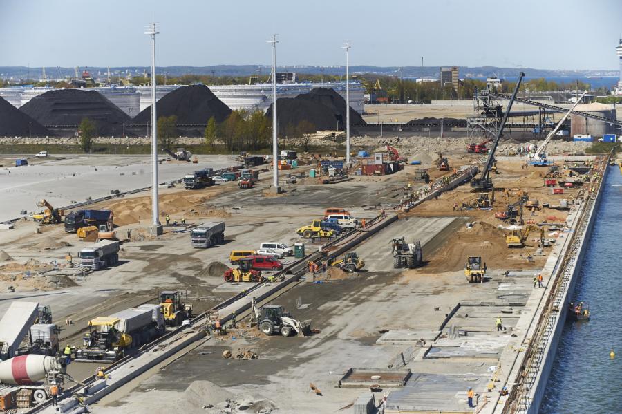 Na początku maja do DCT (Deepwater Container Terminal) dopłynął statek z pierwszymi suwnicami STS przeznaczonymi do obsługi terminalu T2, które będą największymi urządzeniami tego typu w Polsce. Nowy terminal podwoi zdolność przeładunkową gdańskiego portu. Suwnice STS z terminalu T2 to największe tego typu urządzenia w Polsce. Ich wysokość sięga 82 metrów a ramię na długość 78 metrów. Tak potężna konstrukcja umożliwi obsługę 25 rzędów kontenerów. <br><br>fot. (cat) PAP/Dominik Kulaszewicz