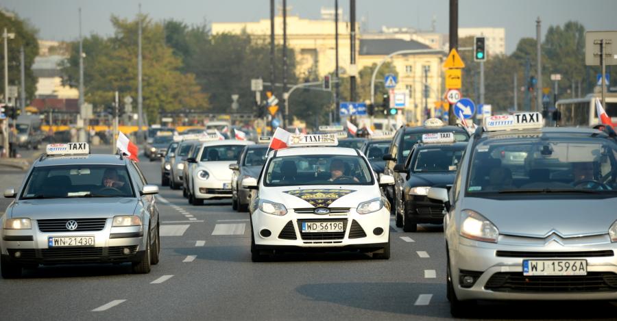 Kierowcy taksówek jeżdżą oflagowanymi samochodami wolno, zgodnie z przepisami, żeby zaprotestować przeciwko nieuczciwej konkurencji ze strony firm przewozowych, które bez uprawnień, bez specjalnej licencji, nie płacąc podatków, wożą pasażerów. Protest taksówkarzy w Warszawie. Taksówkarze na pl. Bankowym (cat) PAP/Jacek Turczyk Jacek Turczyk Protest taksówkarzy w Warszawie. Taksówkarze na pl. Bankowym (cat) PAP/Jacek Turczyk Jacek Turczyk Protest taksówkarzy w Warszawie. Taksówkarze na pl. Bankowym