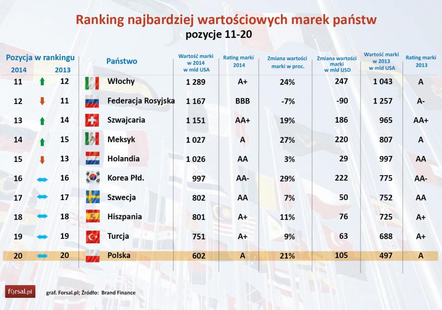 Polska dysponuje 20. najbardziej wartościową marką narodową na świecie - wynika z rankingu najbardziej wartościowych marek narodowych, sporządzonego przez Brand Finance. Choć wciąż wyprzedza nas Rosja, to nasza marka jest warta więcej niż narodowe marki Austrii, Belgii, Norwegii czy Finlandii. 10. Brazylia Wartość marki narodowej Brazylii zmniejszyła się w tym roku o 5 proc. do poziomu 1,403 bln dol. Oznacza to spadek w rankingu o dwie pozycje (miejsce 8 w 2013 roku). Można mówić o wielu przyczynach