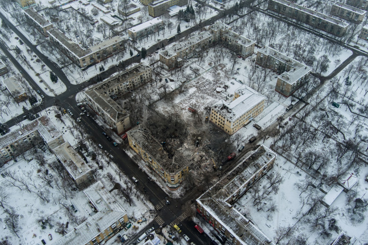 Usuwanie zniszczeń po uderzeniu rosyjskiego pocisku rakietowego na jednym z osiedli Kramatorska w obwodzie donieckim, 2 bm. Jeden wielopiętrowy budynek mieszkalny został całkowicie zburzony, ok. 10 innych uległo uszkodzeniom. W wyniku ataku zginęły co najmniej 3 osoby, a ok. 20 zostało rannych. Trwa inwazja Rosji na Ukrainę. (jm) PAP/Alena Solomonova Ukraińscy ratownicy pracują na miejscu po nocnym ataku rakietowym na dzielnicę mieszkaniową w Kramatorsku na Ukrainie, na początku 2 lutego 2023 r.