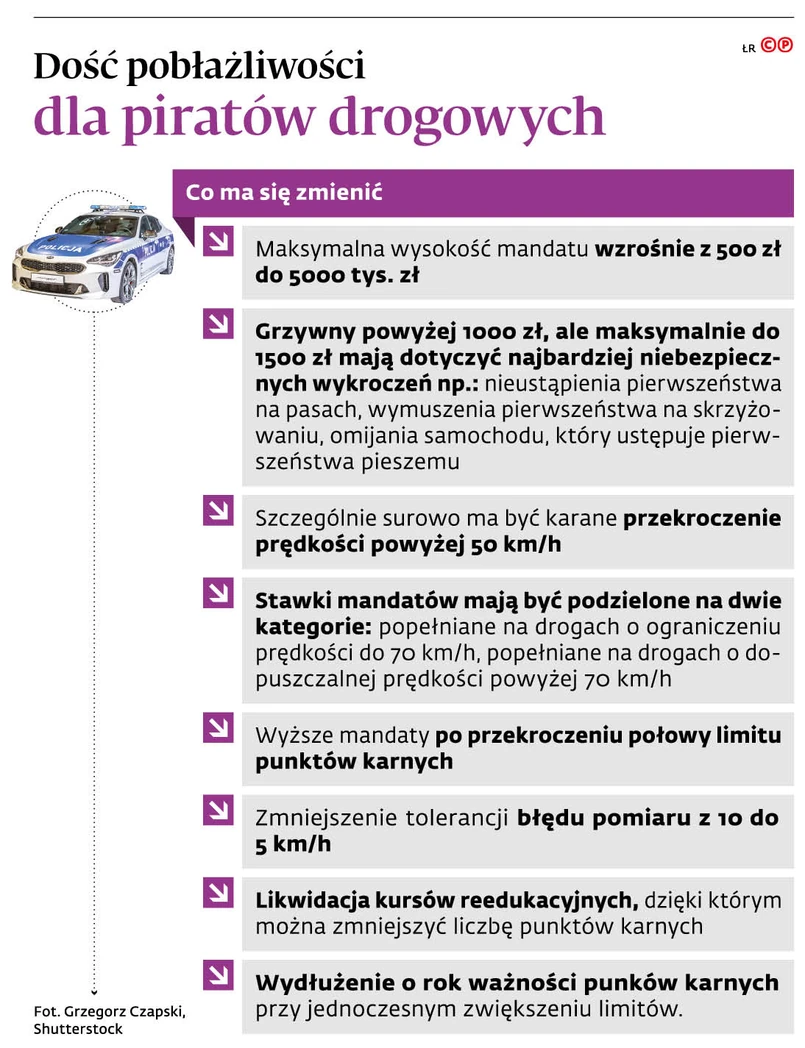 Według założeń projektu, którego opracowanie zlecił premier, maksymalna kwota mandatu karnego ma wynieść 5 tys. zł. „Przy konstruowaniu taryfikatora mandatów należy również uwzględnić przypadki przekroczenia dopuszczalnej prędkości o więcej niż 50 km/h. Właśnie sprawcy takich wykroczeń powinni być szczególnie dotkliwie karani, nie tylko poprzez czasowe zatrzymanie prawa jazdy, ale również sankcje o charakterze finansowym” – instruuje szef rządu.