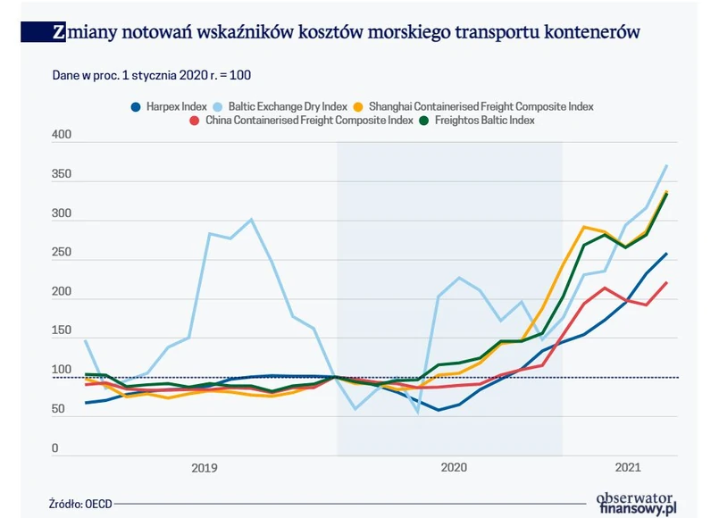 Tylko w ciągu pierwszych pięciu miesięcy 2021 r., od stycznia do maja – jak zauważają eksperci OECD – stawki frachtowe wzrosły w świecie od 30 do 65 proc. Przyjmując za 100 wartość londyńskiego wskaźnika BDI, podskoczył on do początku maja o 60,6 proc. Jeszcze wyżej, o 67,9 proc., wzrósł w tym czasie hamburski Harpex.