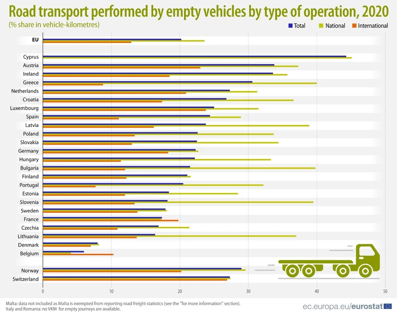 Spośród państw członkowskich, dla których dostępne są dane, najwyższy udział w przypadku całkowitego drogowego transportu towarowego odnotował Cypr, gdzie puste przebiegi stanowiły 44 proc. pojazdokilometrów (inaczej wozokilometr - wkm - jednostka miary w transporcie kołowym oznaczająca długość drogi pokonanej przez środki transportu w określonym czasie). Takie wyniki najprawdopodobniej świadczą o tym, że większość kursów albo przewozi towary importowane przez porty, albo dotyczy ruchu budowlanego, który w dużej mierze jest ruchem jednokierunkowym.