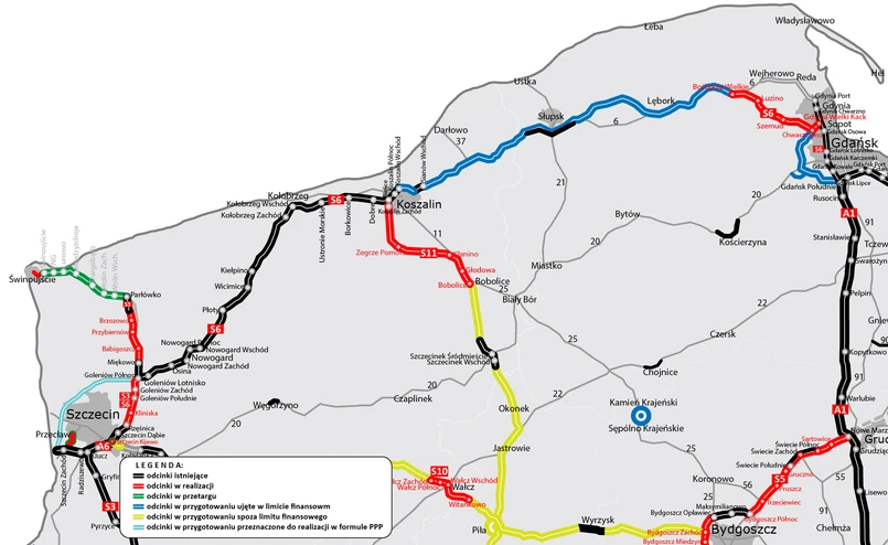 Jeszcze w tym roku, w IV kwartale, ogłosimy przetarg na realizację blisko 8-kilometrowego odcinka od końca obwodnicy Koszalina do końca obwodnicy Sianowa. To odcinek, na którym wystąpiły odmienne warunki geologiczne w postaci podziemnego jeziora ulokowanego poniżej poziomu prowadzonych badań geologicznych. Opracowano już dokumentację i złożono wniosek o wydanie decyzji o zezwoleniu na realizację inwestycji drogowej (ZRID). Trwa jeszcze aktualizacja projektu pod planowany węzeł Gorzebądz.