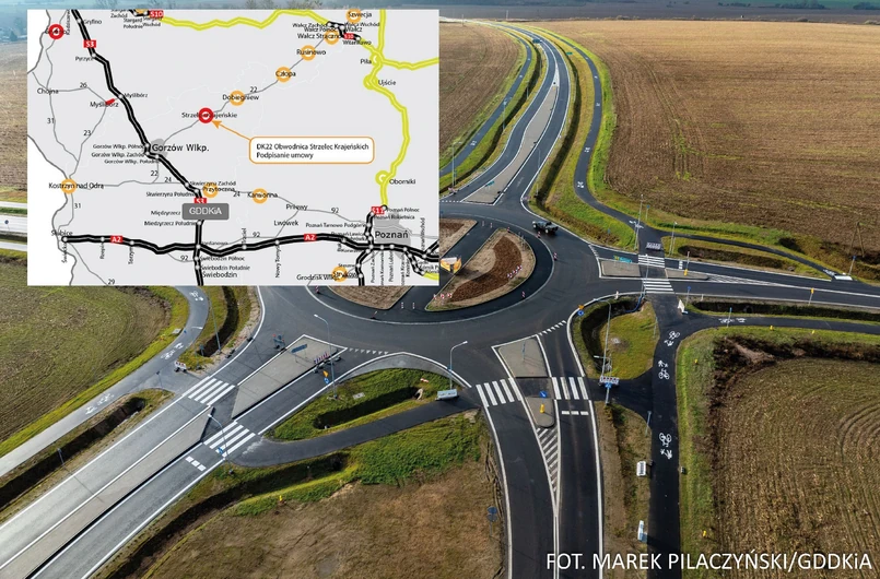 Obwodnica Strzelec Krajeńskich jest częścią DK22. Ponad 7 km trasa została poprowadzona nowym śladem po północnej stronie miasta. Na ten cel wydano ponad 77 mln zł. Obwodnica pozwoli wyprowadzić ruch tranzytowy poza miasto, co odciąży istniejącą sieć dróg lokalnych. Inwestycja była zrealizowana w systemie Projektuj i buduj. Umowę z wykonawcą została podpisana w maju 2021 r.