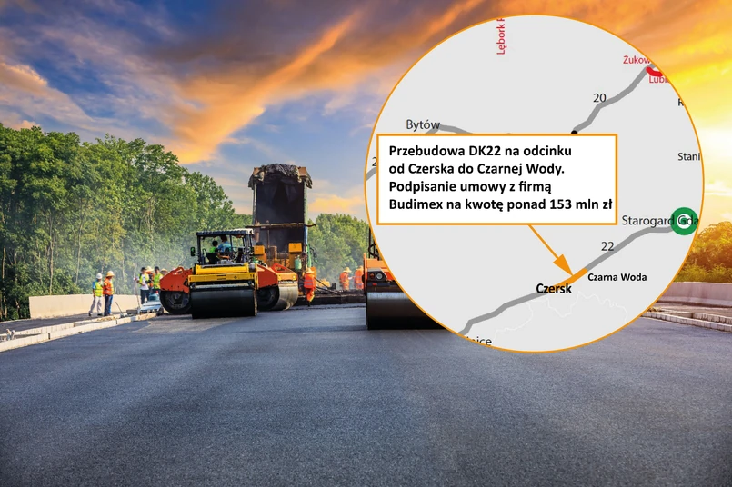 W czwartek GDDKiA podała informację o podpisaniu umowę firmą Budimex na zaprojektowanie i przebudowę drogi krajowej nr 22 na odcinku od Czerska do Czarnej Wody (woj. pomorskie). Kontrakt opiewa na kwotę ponad 153 mln zł.